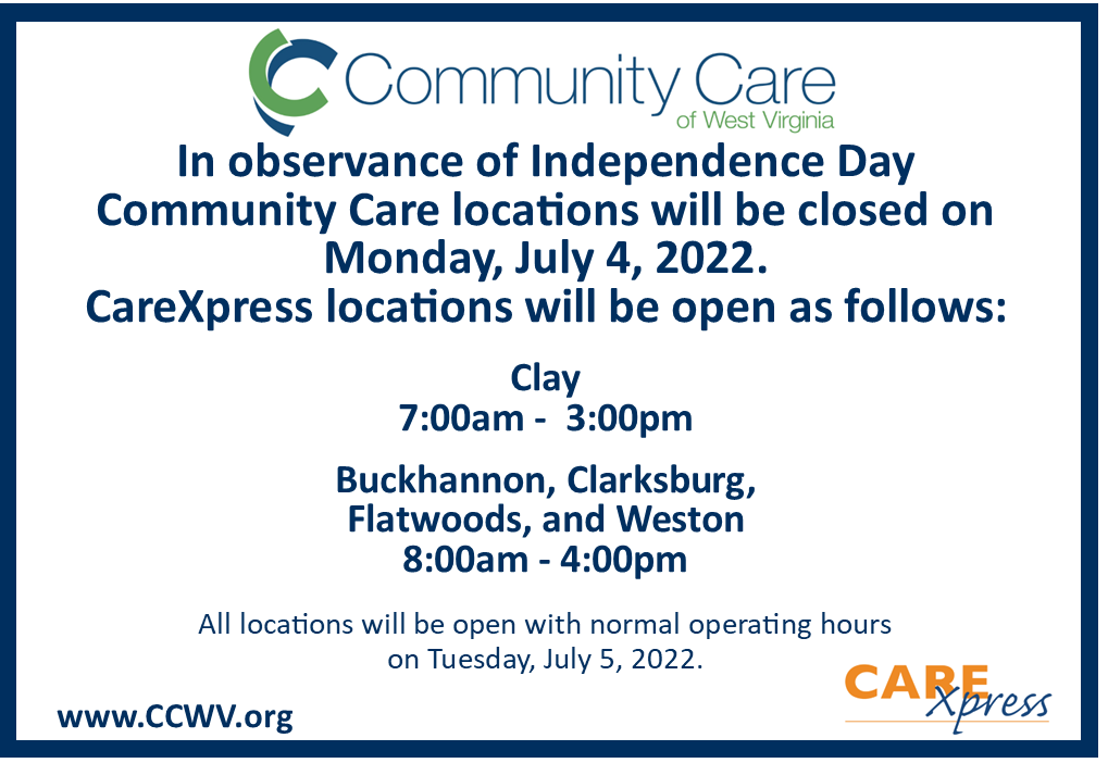 Monday 700am To 500pm Tuesday 700am To 500pm. COMMUNITY CARE OF WEST VIRGINIA INC. For direct access to information about our health centers including our walk-in locations click on the site location below.